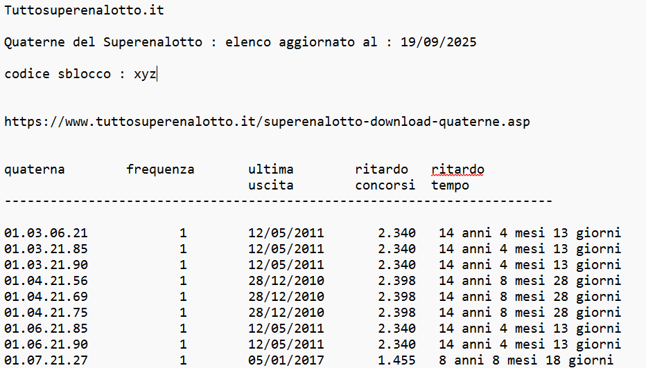 Hai scelto di scaricare il file Quaterne SuperenaLotto al costo di 4 euro. Il file è completo con tutti le quaterne uscite, è ammesso il download in TXT o XLS o entrambi. Concluso il pagamento è possibile scaricare le quaterne uscite. Nella prima riga del file di Donwload troverai una password valida per futuri download di questo stesso file quindi paghi una volta e scarichi all'infinito il file QUATERNE SUPERENALOTTO sempre aggiornato all'ultima estrazione.